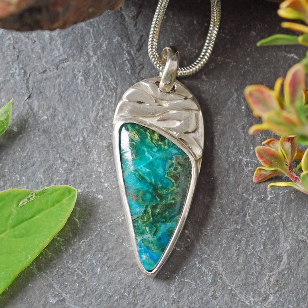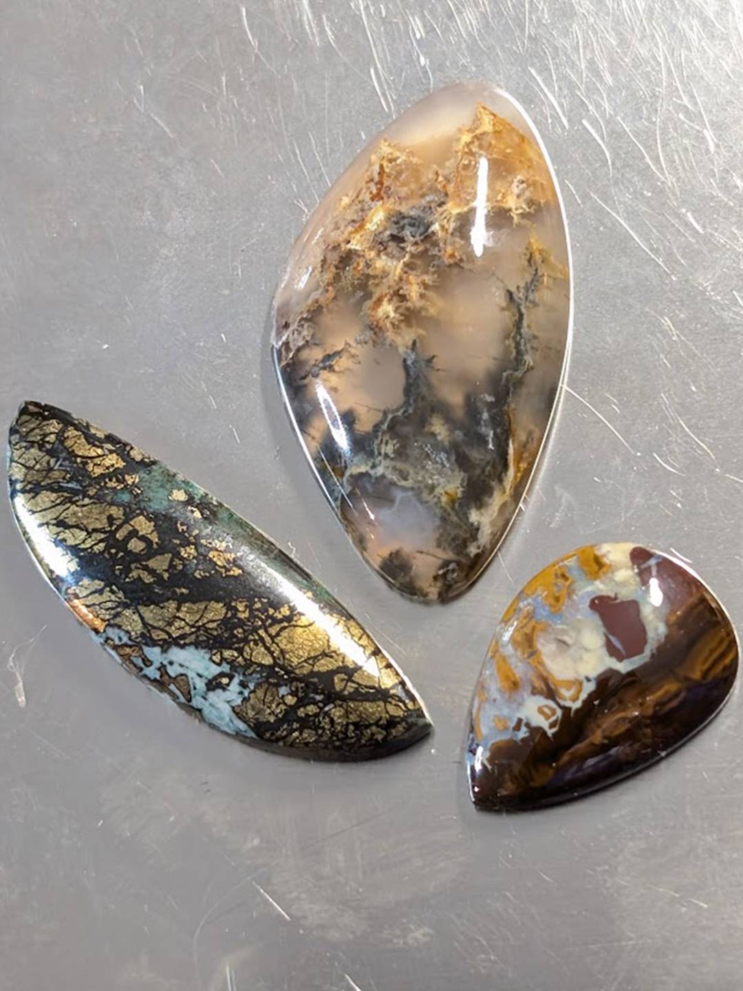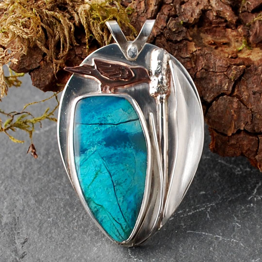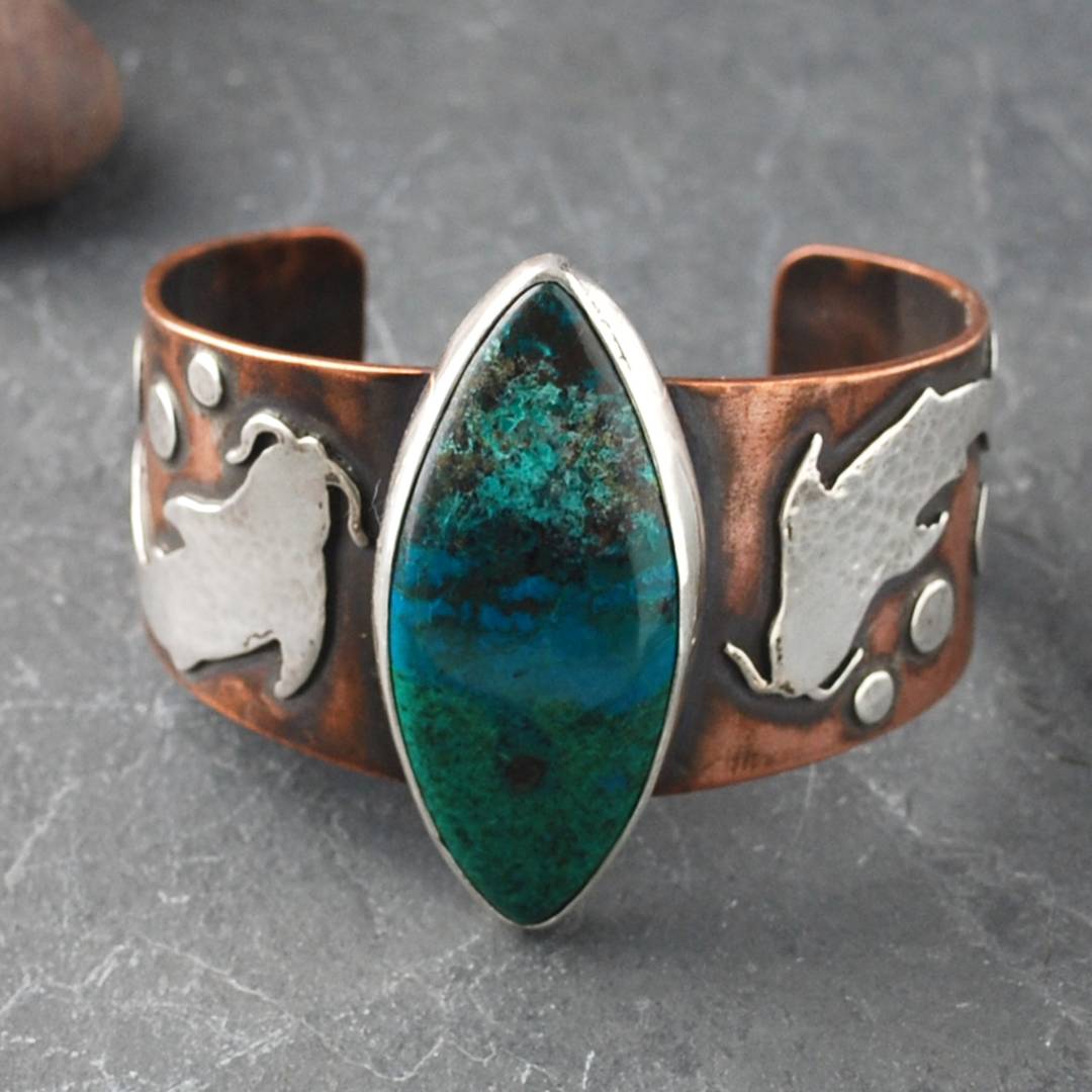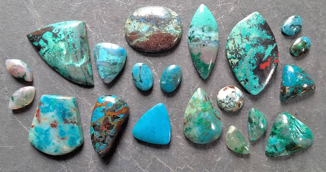 Welcome to my newsletter, both new and continuing subscribers. I hope you enjoy it! Barbara Kay Jewelry News The Clark County Open Studios tour is now over for this year. I had a wonderful weekend, meeting new people and also spending time with a few returning visitors. I do love talking about my passion for metal-smithing and creating jewelry. I have one more live event this year: The Laurelhurst Winter Bazaar, which will take place on December 7 from 10 to 4. The bazaar is at the Laurelhurst school - 840 NE 41st Ave in Portland, Oregon. It's a terrific bazaar - all of the vendors are vetted, and all things sold are hand made and of good quality. It's a great pre-Christmas bazaar! Audience Participation and Challenges One thing I love to do at the studio tour is to include visitors in my creative process. It's hard for me to find a way for people to actually "do" something with the tools, so I ask them to participate by choosing my next projects. This also challenges me as I often get ideas and stone choices that I might not select myself. I offer three ways to give me my idea challenges. I randomly choose cabochons (shaped and polished stones) from my collection. I try to pick out various sizes, colors and shapes and try not to let my own feelings about them come into the decision. Studio visitors can vote on their favorite two or three. I also ask for their ideas on wildlife (or other animals/aspects of nature) to use on future projects, and for ideas of things to include with future mushroom pendants. Based on the number of dots, the group of stones on the left below will become my first projects after the ones I'm currently working on. From left and around clockwise: Chrysocolla-Malachite; Tiger's Eye; Owyhee Picture Jasper; Tiffany Stone. They each earned seven to nine votes. The stones on the right will become the group after that: (left to right) Golden Eclipse Malachite; North Ridge Plume Agate (from the same area as Graveyard Point); Boulder Opal. They each earned five or six votes. A number of stones received three votes each; I will keep them in mind for the future. Based on the list of ideas, (and keeping in mind animals I've featured in the past) I've decided that my next animal/wildlife jewelry will include: raccoon, salmon (or possibly sturgeon), hedgehog, and in honor of a little girl who visited with her stuffed pig, a pig. Charlotte's Web keeps creeping into my mind. I also got a request for ocean themed jewelry, so we will see what I can do about that. I haven't really decided on the mushrooms, yet - but I think I have enough projects to keep me going until well into next year! Current Projects If you saw the email I sent out before the tour, you saw a few groups of stones that I am currently working on. Three of those stones were planned for "starry night" pendants. They are now in progress; I have cut out all of the little stars and other components that will be added alongside each stone. The next step will be to sand and file everything - and yes, I even file the edges of those little bitty stars, using very small "needle" files! I also showed you a few stones ready to use for rings and cuffs; they may be put on hold for a bit as I will be working on filling in "holes" in my inventory for the Laurelhurst Bazaar. Stone of the Month: Chrysocolla If your favorite colors include green and blue and all shades in between, then you will love chrysocolla. As you can see in the picture, it can have an amazingly vivid aqua color that is truly eye catching, as well as softer turquoise shades. Chrysocolla is one of a number of minerals that form near copper, which is what gives chrysocolla its color. Chrysocolla, in fact, is so prevalent around copper ore that it has been used by miners and geologists as an indicator mineral; in other words, where Chrysocolla is found, there is a good chance that copper deposits will also be found by digging deeper in the same location. The name Chrysocolla (pronounced kriss-oh-KOL-uh) comes from the ancient Greek 'chrysos' which means gold, and 'kolla' which means glue. It is thought that the name referred to it being used as an ingredient in gold solder (or possibly the flux used in soldering), although tests of ancient gold artifacts have not definitely proved that. Chrysocolla was formed when very hot copper-bearing fluids interacted with various types of rock, or when hot mineral and silica rich fluids flowed through and interacted with copper containing rocks. As with many of the semi-precious stones we love, Chrysocolla primarily formed where there was volcanic activity which created the high heat necessary. It developed in three different forms. One was as botryoidal (or globular) masses. This occurred when the liquid mineral grew around "nuclei" such as sand or dust particles - very similar to pearl formation. This resulted in shapes like clustered grapes. It sometimes formed as crusty layers on the surface of rocks, and also as veins where the copper rich fluids filled in cracks in rocks. Chrysocolla has not typically been mined for itself; it is rather a by-product of copper mining. It can be found anywhere where there is copper and especially where there was volcanic activity. Some of the major deposits can be found in Arizona (and other southwestern states in the US), Democratic Republic of Congo, Peru, Australia and Mexico. These pictures show chunks of quartz and other rock with chrysocolla in them. These stones were collected in SW Washington by my daughter - photos are courtesy of Erin Secrist. The bottom right picture shows how beautiful Chrysocolla and its host rock can be when polished. Chrysocolla is a soft mineral; pure chrysocolla is generally too soft for cutting and polishing into stones meant for jewelry. But fortunately for us, it often forms alongside other minerals which add durability and hardness. Other copper bearing minerals that are often found intermingled with chrysocolla include Malachite (green), Azurite 